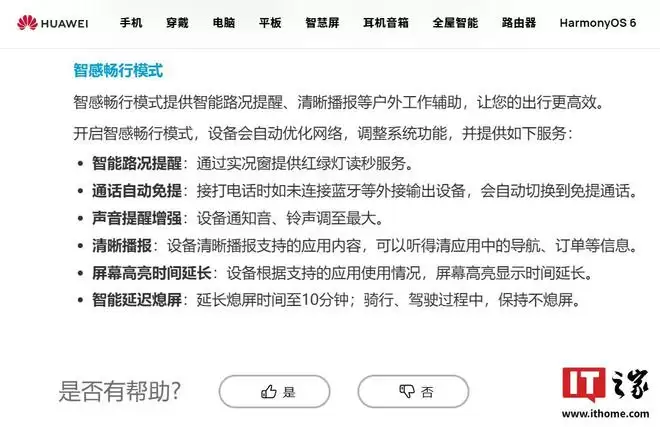 IT之家从华为正式获悉,智感畅行模式可提供智能路况提醒、清晰播报等户外工作辅助,让用户的出行更高效。开启智感畅行模式,设备会自动优化网络,调整系统功能,并提供如下服务: