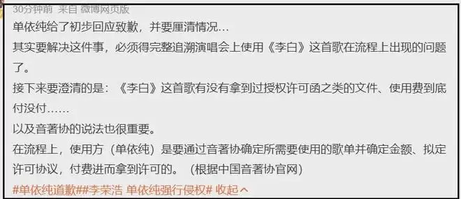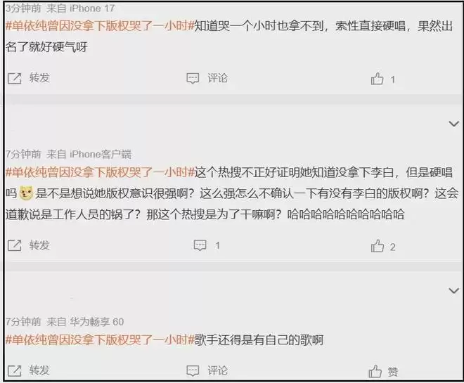 微妙的是,单依纯曾经没有拿下邓丽君《君》的版权而痛哭一小时,李荣浩炮轰单依纯侵权之后,相关话题还登上了热搜,更让网友怀疑单依纯演唱会上七首翻唱歌曲是否拿到授权。