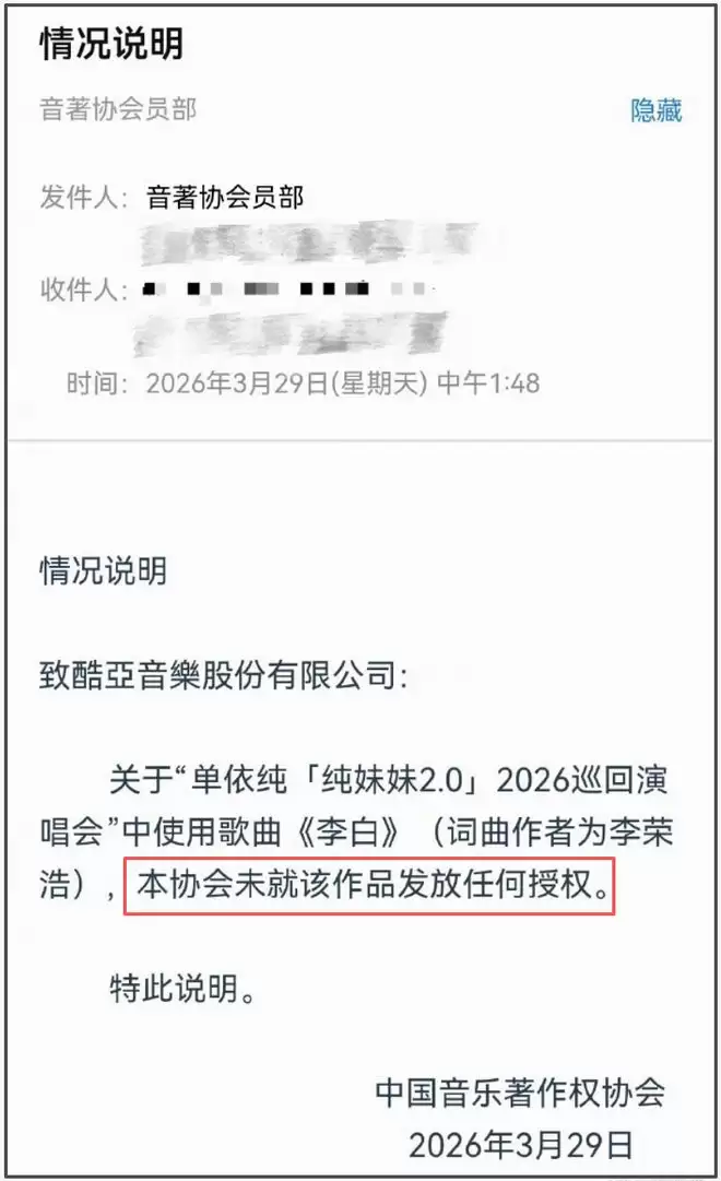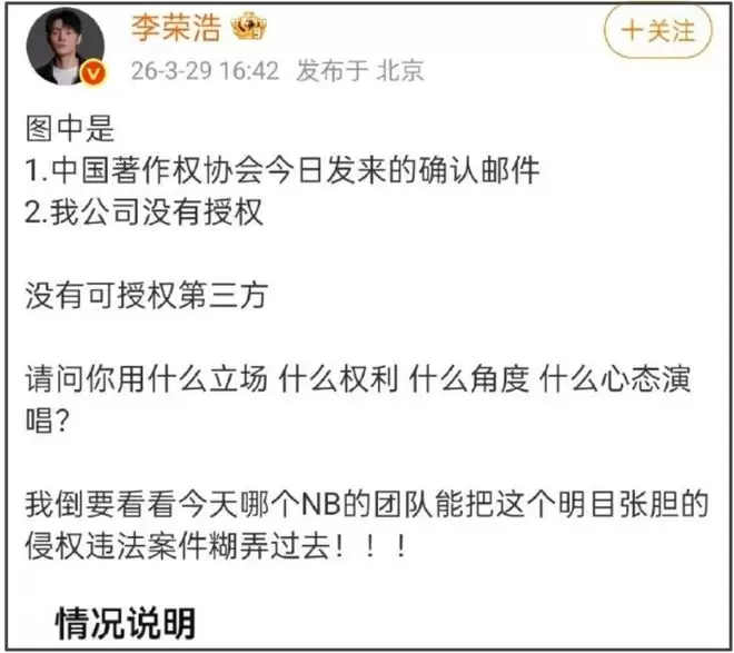 等待单依纯进一步回应期间,李荣浩再次发文,强调著作权协会确认没有任何授权,质问单依纯用什么立场、什么权利、什么角度、什么心态演唱,一句“我倒要看看今天哪个NB的团队能把这个明目张胆的侵权违法案件糊弄过去”硬刚到底。