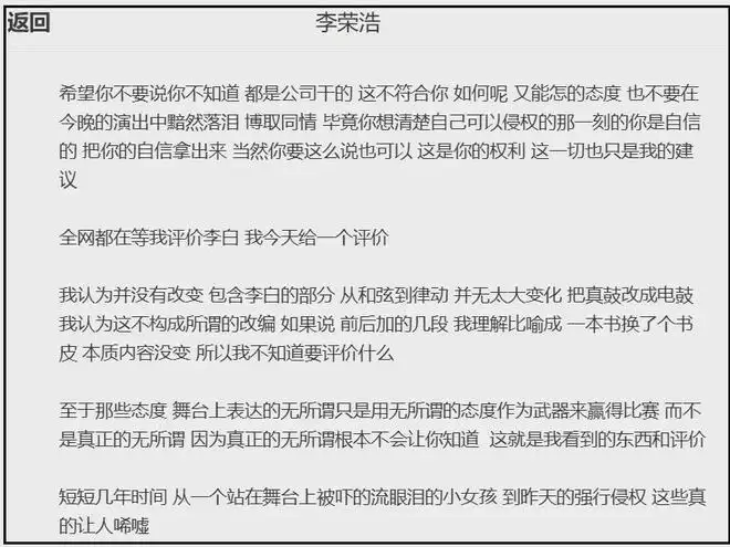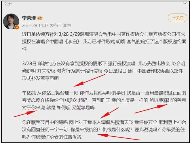 关于单依纯演唱会翻唱涉嫌侵权的事,李荣浩仅用两段话进行说明,接下来每一段都是带有一定情绪的控诉。