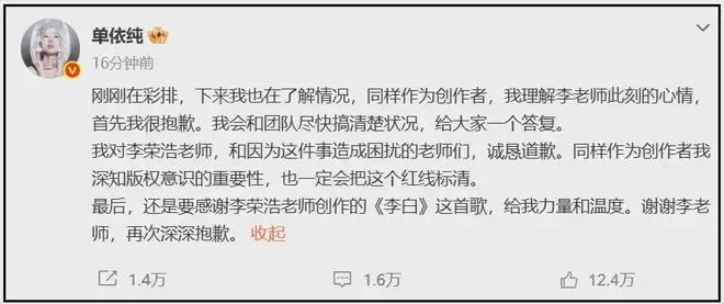 内娱又有明星正面开撕啦!41岁歌手李荣浩公开指责单依纯侵权,发了长文炮轰对方在没有拿到授权的情形下强行演唱了李荣浩原创歌曲《李白》,不愧是原创歌手,自己靠自己吃饭就是硬气。