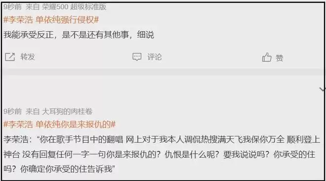 李荣浩晒单依纯侵权证据四问硬刚:勿靠团队糊弄