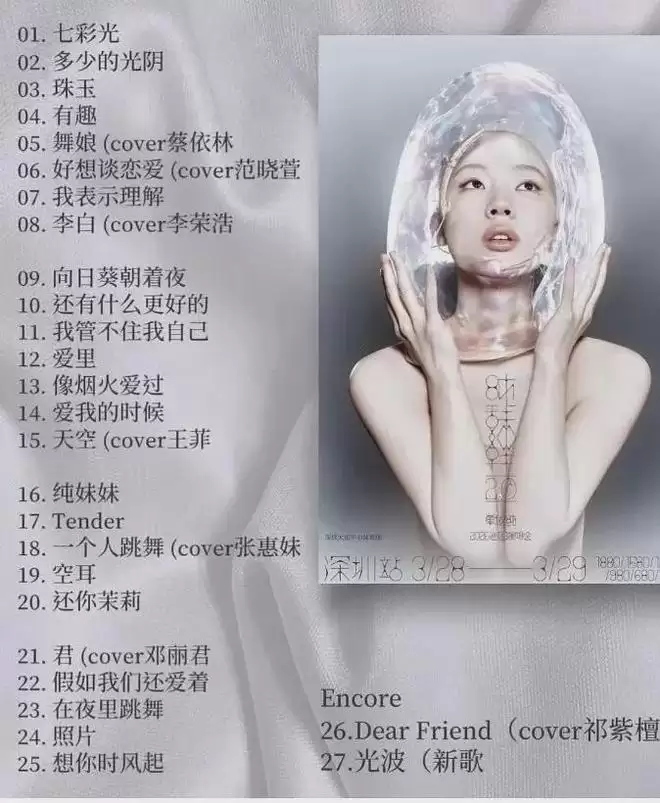 单依纯最新演唱会歌单显示,她计划在深圳两场演唱会上演唱27首歌,其中包含7首翻唱(翻唱占比有点高呀)。