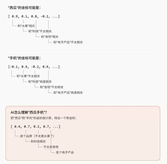 更重要的是,AI理解任何一个词,都要看它和其他词的关系。比如“西瓜”这个词,AI在训练中既见过它和“手机”“汽车”“公司”“发布会”一起出现,也见过它和“吃”“食物”“好吃”一起出现。当AI看到“西瓜手机”这个组合时,它会通过“汽车”这个词的坐标,来调整“西瓜”在当前这句话里的含义——让它的坐标更接近“品牌”,远离“食物”。