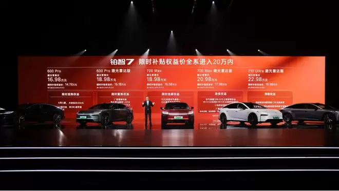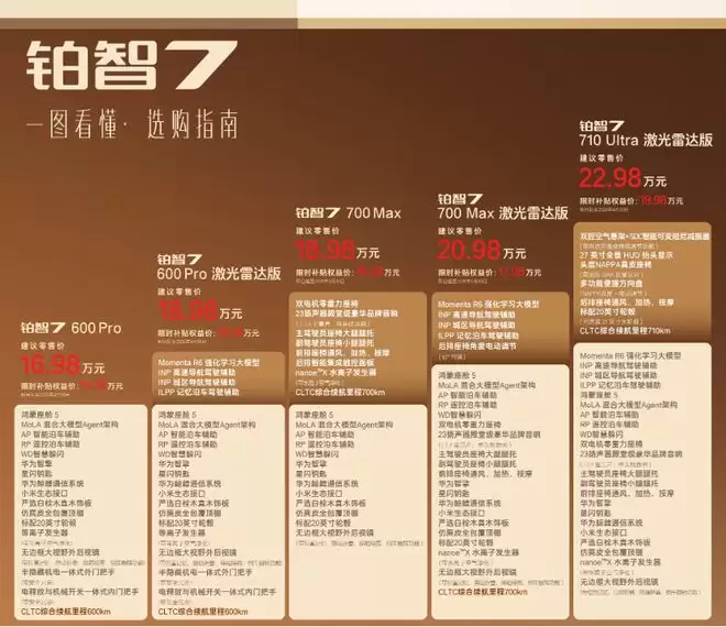 铂智 7 共推出 6 个版本, 指导价区间为 16.98 万元至 22.98 万元,整个版本体系的配置递进比较清晰。