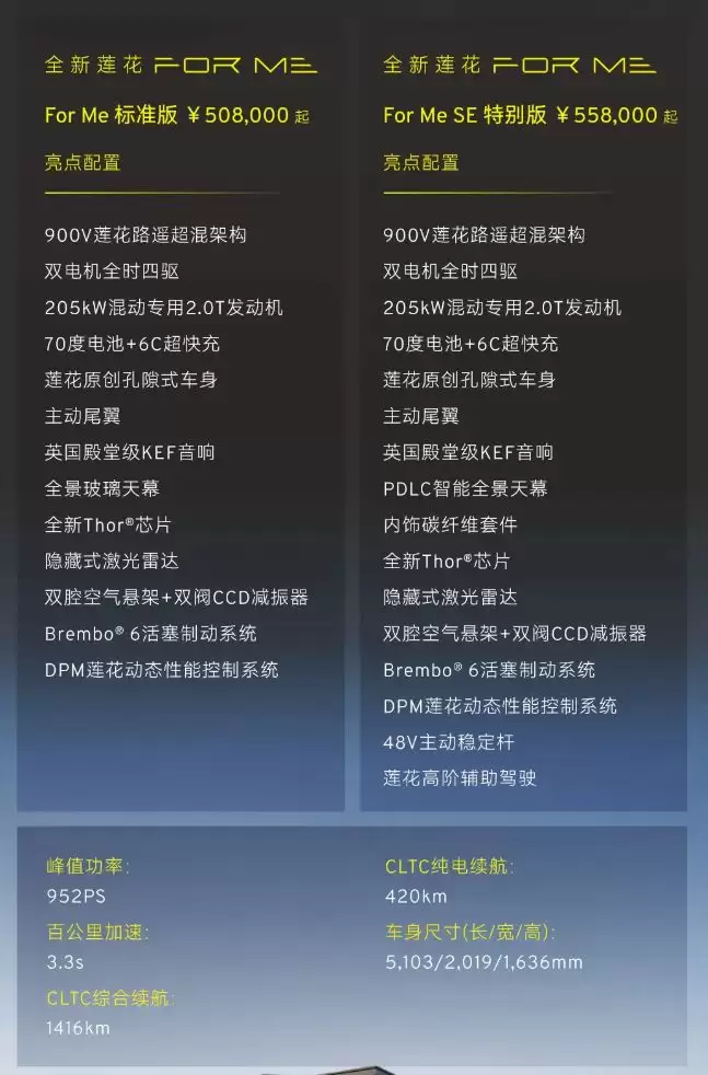 标准版 50.8 万元起900V 莲花路遥超混架构双电机全时四驱205kW 混动专用 2.0T 发动机70 度电池 +6C 超快充莲花原创孔隙式车身主动尾翼英国殿堂级 KEF 音响全景玻璃天幕全新 Thor 芯片隐藏式激光雷达双腔空气悬架 + 双阀 CCD 减振器Brembo6 活塞制动系统DPM 莲花动态性能控制系统特别版 55.8 万元起900V 莲花路遥超混架构双电机全时四驱205kW 混动专用 2.0T 发动机70 度电池 +6C 超快充莲花原创孔隙式车身主动尾翼英国殿堂级 KEF 音响PDLC 智能全景天幕内饰碳纤维套件全新 Thor 芯片隐藏式激光雷达双腔空气悬架 + 双阀 CCD 减振器Brembo6 活塞制动系统DPM 莲花动态性能控制系统48V 主动稳定杆莲花高阶辅助驾驶