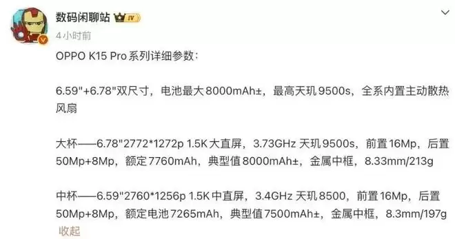 在此之前,博主@数码闲聊站 的一份爆料中提到了OPPO K15 Pro系列的详细参数。