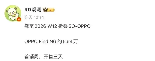 参考博主@RD观测 的数据来看,OPPO Find N6 自3月20日开售以来,首销三天销量突破5.64万台,进入当周( 2026 年第 12 周)手机激活量Top 30。其中,Find N6的卫星通讯版占比大概是30%。