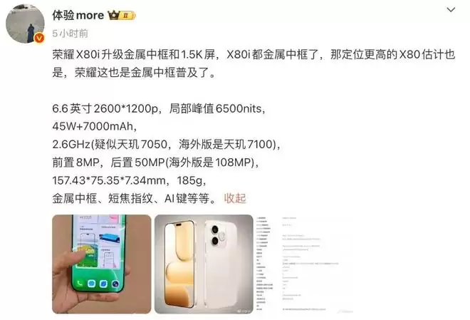 这份爆料显示,这款荣耀X80i升级金属中框和1.5K屏,6.6英寸2600*1200p,局部峰值6500nits,45W充电,7000mAh电池。