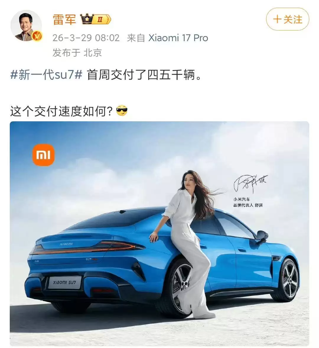 雷军公布SU7新车首周交付量,四五千辆今晚揭晓