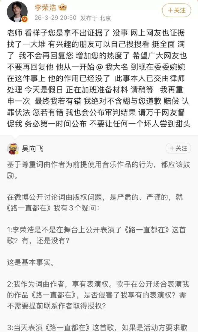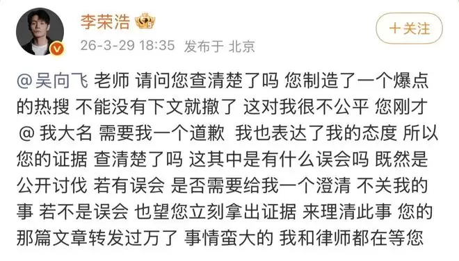 内娱多久没有这样亲自下场、表达清晰、在线跟进、正面硬刚的艺人了,支持想要赛博升堂或开撕的艺人,都按李荣浩这个标准来好吗?