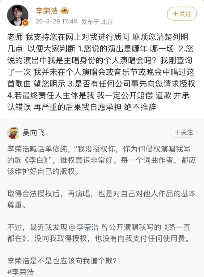 然而这场版权之争还没完,又一位歌手吴向飞出来加入乱局,说李荣浩也侵权了自己的歌。