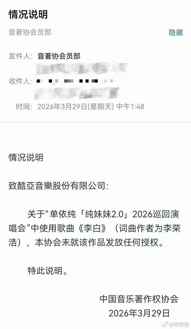 今天下午李荣浩发博,说单依纯侵权演唱了自己的《李白》,不算长的推文却言辞犀利,一点情面也无。随后又发出著作权协会的邮件佐证,表示从未发放过任何授权。如此硬刚,单依纯这边也很快回应,说自己刚彩排结束