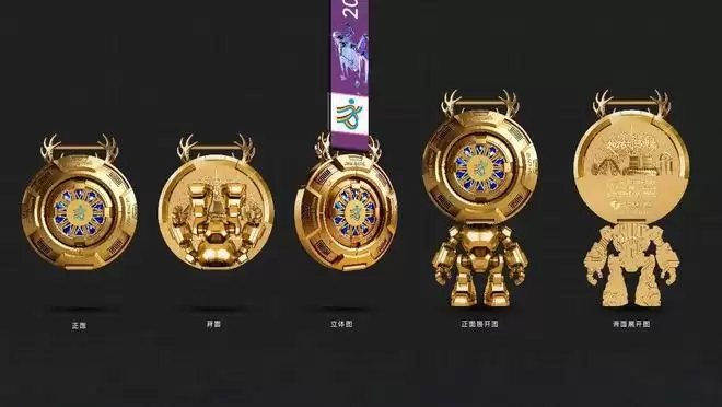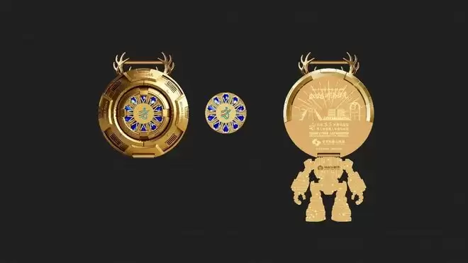奖牌创新采用可展开结构,展开部分化身人形机器人躯体,与上方圆形主体组合,构成立体生动的人形机器人形态,整体兼具艺术观赏性与互动趣味性。