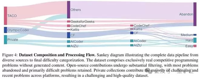 随后,以模型实际通过率为基准对预测分进行校准,在LiveCodeBench数据集上确定易、中、难的分界值,预测分布与实际分布几乎完全吻合。过滤后,简单题占比降至25%以下,困难题占比提升至50%以上。