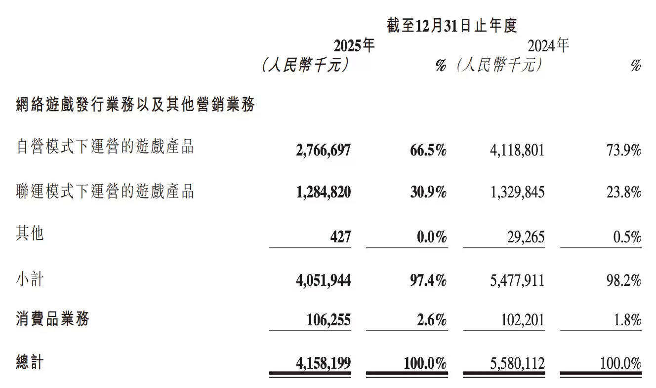针对公司总营收下滑的主要原因在于自营游戏收入大幅减少。财报显示,2025年自运营游戏收入为27.67亿元,较2024年的41.19亿元下降32.83%。