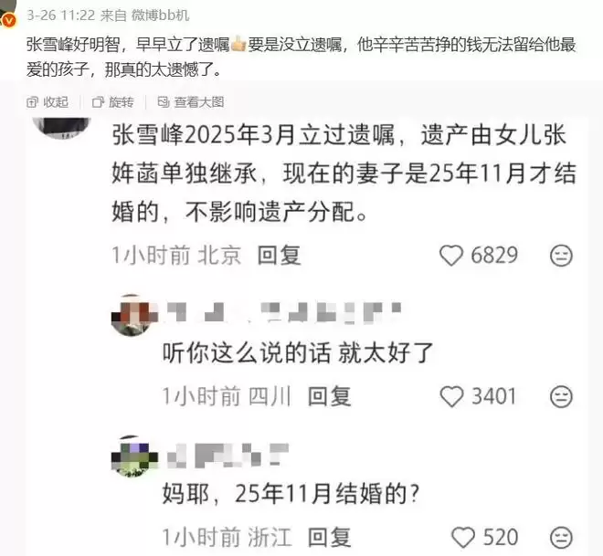 网友说去年3月张雪峰就立过遗嘱了,遗产由女儿单独继承,真的是把所有的爱都给了女儿。