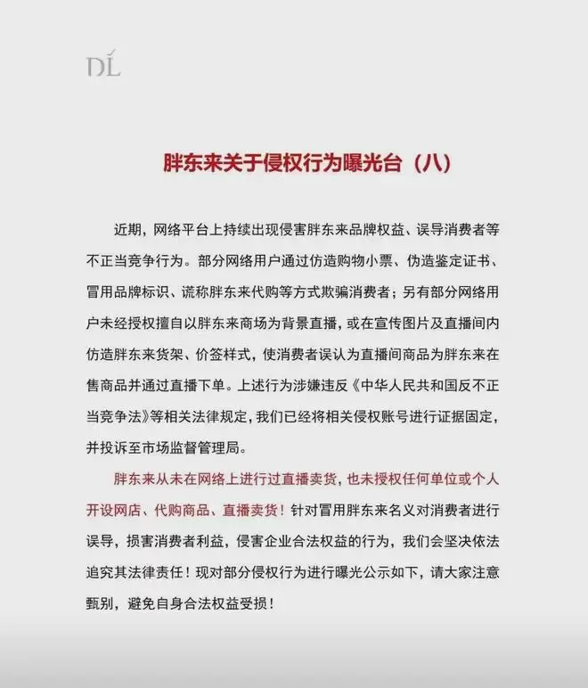 【胖东来曝光小方糖戒指仿冒乱象】3月29日,河南胖东来商贸集团发布第八期侵权行为曝光公告,提到网络平台上针对旗下热门商品“小方糖”戒指的仿冒侵权行为。据公告披露,部分商家在电商平台及社交渠道发布商品时,刻意搭配伪造的胖东来购物小票、品牌鉴定证书,将仿冒“小方糖”戒指包装为“胖东来正品代购”商品。这些伪造凭证完整复刻了胖东来购物小票格式、品牌标识及鉴定证书样式,极具迷惑性,导致不少消费者误以为购买到最新正品,实则为低成本仿冒品。胖东来方面明确表示,公司从未授权任何单位或个人开展网络代购、网店销售等业务,“小方糖”戒指仅通过线下门店及最新指定渠道发售。针对此次曝光的仿冒行为,胖东来已完成相关侵权账号的证据固定,并正式向市场监督管理部门投诉,将依法追究侵权方的法律责任。(大象新闻)