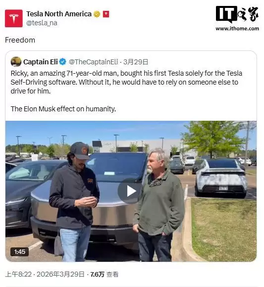 IT之家 3 月 30 日消息,据 Electrek 报道,特斯拉北美最新 X 账号转发推广了一则全新 Cybertruck 车主的采访视频。这位车主称,自己视力不断衰退,眼科医生建议他购买搭载 FSD 功能的特斯拉车型。