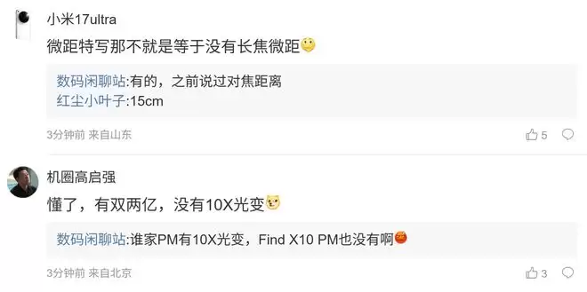 后续有用户在评论区表示:“懂了,有双两亿,没有 10X 光变 [狗头斜眼]”,博主回复道:“谁家 PM 有 10X 光变,Find X10 PM 也没有啊”;另一名用户则询问道:“微距特写那不就是等于没有长焦微距”,博主则回复道:“有的,之前说过对焦距离”。