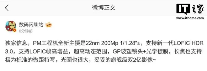 IT之家 3 月 30 日消息,博主 @数码闲聊站 今天在微博透露,某厂的 PM 工程机搭载全新 2 亿像素 1/1.28"± 主摄,基于 22nm 工艺打造。