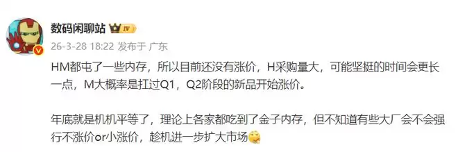 这样算下来就是国内主流六大品牌三个涨价、三个不涨价,这比例真均衡。苹果不涨价的原因其实行业早就分析过,那是由于iPhone的利润本来就高,加iPhone的平均售价也是最高的,苹果选择了自己承担涨价的这部分成本。而华为与小米为何不涨价呢?行业人士“数码闲聊站”在3月28日给出了的因。他表示:HM都囤了一些内存,因此目前还没有涨价,H采购量大,可能坚挺的时间会更长一些,M大概率是扛过Q1,Q2阶段的新品开始涨价。他还进一步表示年底就是机机平等了,理论上大家采用的全部是金子存储,但不知道有些大厂会不会强行不涨价或者小涨价,趁机进一步扩大市场。