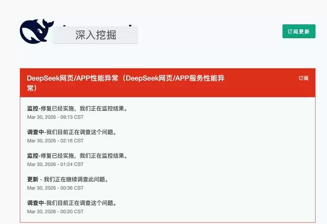 DeepSeek最新今日凌晨关注到服务崩溃问题,曾在1:24和9:13进行两次修复。