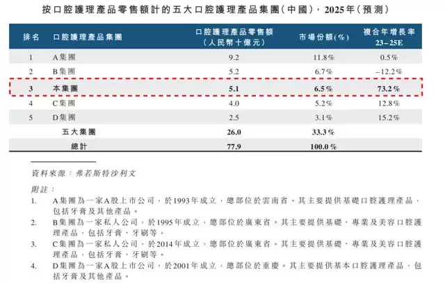 中国口腔护理产品市场零售额于2025年已达779亿元,预计2025年-2030年复合增长率可达4.5%。按照招股书信息,按口腔护理产品零售额计的前五大口腔产品护理集分别为:云南白药集团、好来化工(原黑人牙膏)、小阔科技(参半)、薇美姿(舒克)、登康口腔(冷酸灵品牌),共占33.3%的市场份额。