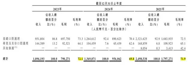 2024年至2025年,小阔科技的毛利率分别为72.1%、69.8%和71.9%。招股书称,其主要牙膏产品建议零售价在9.9元至49.9元之间,而牙膏所在的基础口腔护理板块毛利率也明显领先,同期为73.1%、70.4%、72.5%。