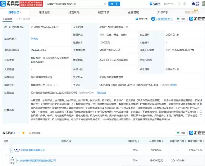 宁德时代成立成都新公司,专注时代电服业务