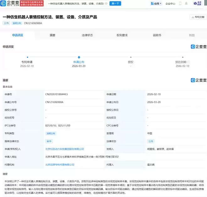 企查查APP显示,近日,北京松延动力科技集团股份有限公司申请公布“一种仿生机器人表情控制方法、装置、设备、介质及产品”专利。