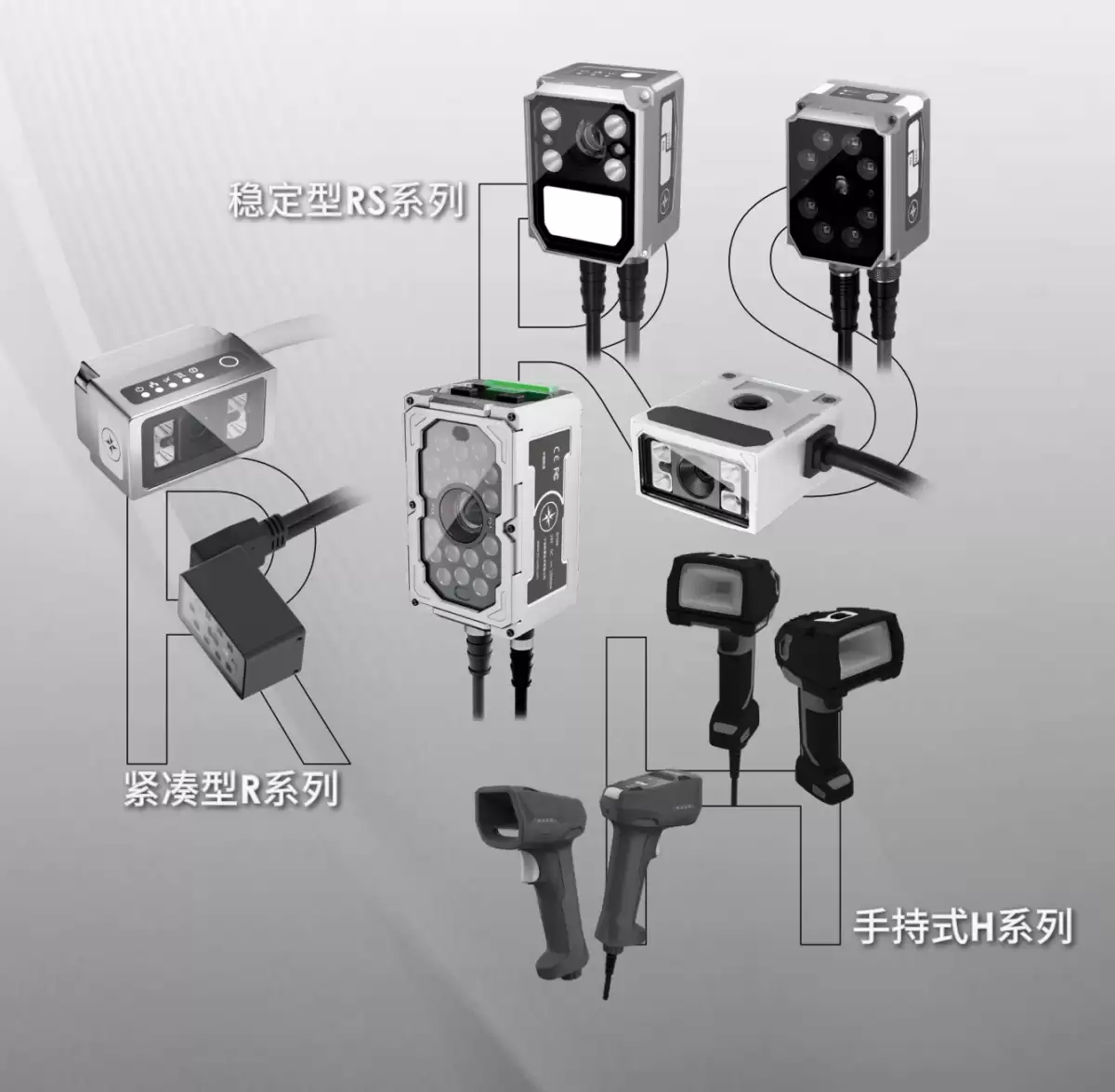 固定式读码器:包括稳定型RS系列(顶配旗舰款RS300、高性能款RS200、RS100、通用款RS60)、紧凑型R系列(紧凑旗舰款R275-A、通用款R172)等。其中,RS300依托超大视野和超大景深优势,可实现最远10米距离水平移动下的稳定读码;RS100的一键调试+与自适应组合光源技术,可稳定读取受栅线干扰、极低对比度的QR码;R275-A通过自研机器视觉算法引擎及超分辨率算法,可稳定读取低对比度、小尺寸的DM码。