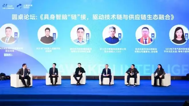 圆桌对话围绕「具身智脑『链』接,驱动技术链与供应链生态融合」展开,聚焦标准共建、场景牵引与生态共赢,科大讯飞、SGS、天脉、灵巧智能、奥比中光等企业代表参与交流。