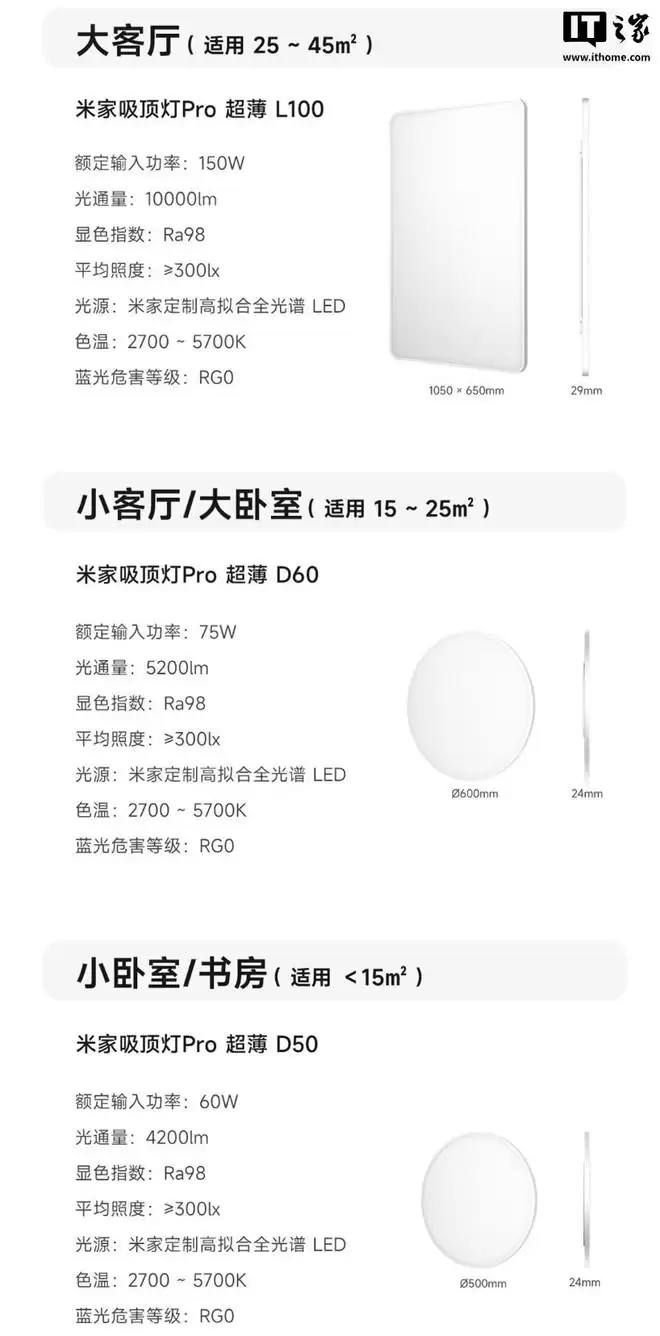 系列灯具采用简约超薄设计,其中 L100 方灯厚度 24mm;D60/50 圆灯厚度 14.5mm,其均采用定制灯珠,提供 Ra98 高显色指数,亮度至高 10000lm,兼容小米米家 App,支持小米澎湃智连。