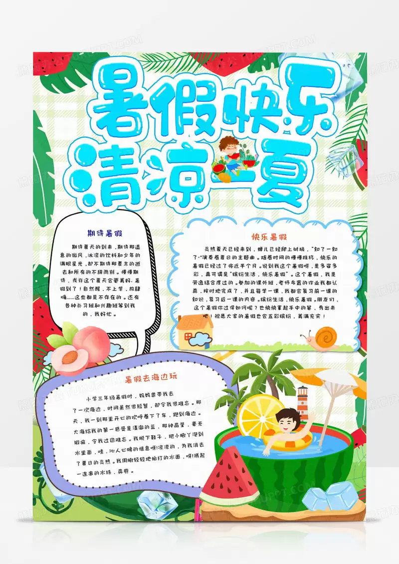 总之,夏日假期手抄报的创意丰富多彩。通过鲜明主题、生动插画、巧妙文字排版、创意边框和互动元素的精心组合,一份独一无二的手抄报就能呈现在眼前。让我们在夏日假期里,拿起画笔,发挥创意,制作出属于自己的精彩手抄报,留下美好的回忆。