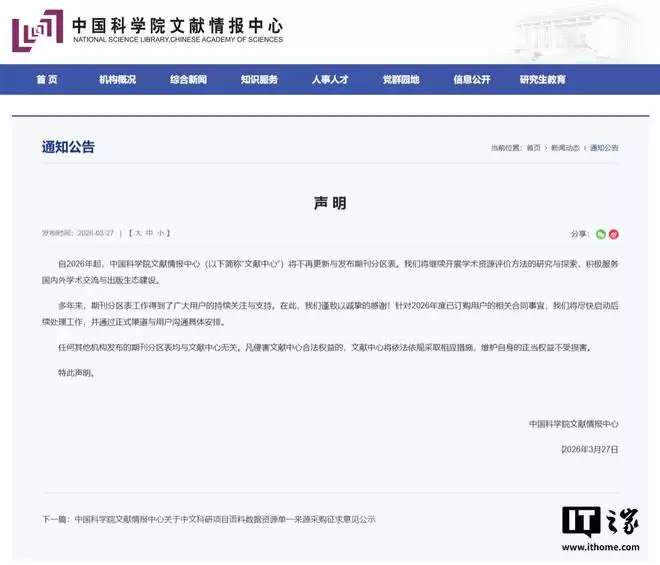 IT之家 3 月 30 日消息,中国科学院文献情报中心在 3 月 27 日发表声明,宣布将不再更新与发布期刊分区表。这标志着运行二十余年、一度成为科研评价“硬标尺”的中国科学院期刊分区表,正式退出历史舞台。