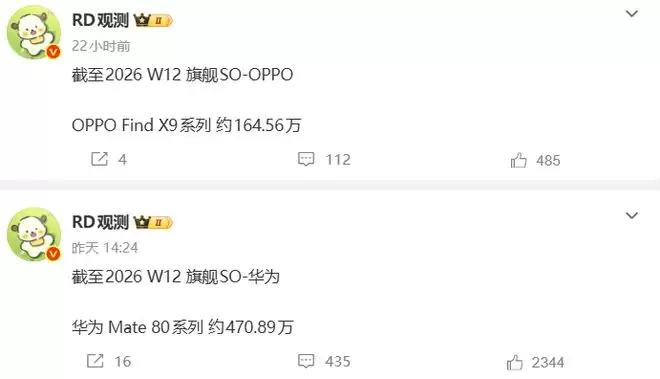 同期,华为Mate 80系列出货470.89万台,位居国产阵营前列;OPPO、vivo旗舰系列均不足200万台。