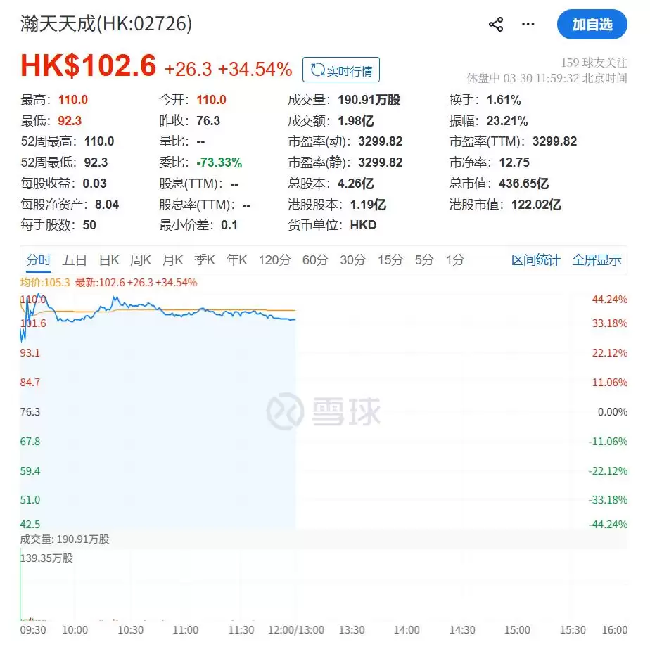 上市首日,瀚天天成高开高走,开盘价为110港元/股,截至午间休盘,瀚天天成股价报102.6港元/股,总市值436.65亿港元。