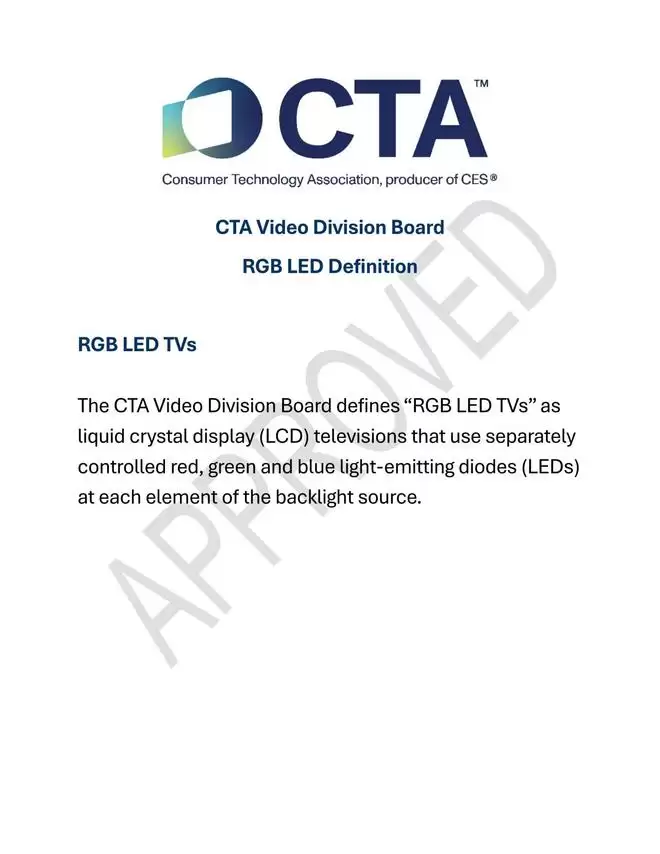 买RGB-Mini LED电视怕踩坑?今后有了全球统一“金标准”!3月26日,全球消费电子领域最具权威性的机构——美国消费技术协会(CTA)正式发布并生效RGB-Mini LED技术认定标准。作为拥有超百年历史、CES主办方,以及全球“4K Ultra HD”“8K”“HDR”等历代电视显示核心标准的制定者,CTA首次明确界定核心准则:RGB-Mini LED电视必须在背光光源的每一个单元,实现红、绿、蓝三色LED独立控制,为全球RGB LED电视树立合规标尺。