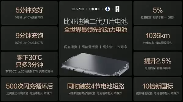 2026年3月,比亚迪发布第二代刀片电池及闪充技术,创下全球量产车最快充电速度纪录:常温下电量从10%充至70%仅需5分钟,从10%充至97%仅需9分钟;即便在零下30℃极寒环境,从20%充至97%也仅需12分钟,彻底解决了新能源汽车"充电慢、低温充电难"的行业痛点。