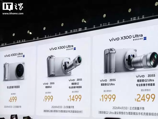 专业影像手柄套装:建议零售价 699 元vivo X300 Ultra 增距镜 G2:建议零售价 999 元vivo X300 Ultra 增距镜 G2 专业影像手柄套装:建议零售价 1499 元vivo X300 Ultra 增距镜 G2 Ultra:建议零售价 1999 元vivo X300 Ultra 增距镜 G2 Ultra 专业影像手柄套装:建议零售价 2499 元