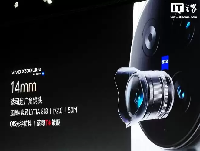 vivo X300 Ultra 后置一枚 5000 万像素 14mm 蔡司超广角镜头,采用蓝图 × 索尼 LYTIA 818 传感器(1/1.28 英寸超大底)+ 蔡司 T* 镀膜,内置第三代 vivo VCS 仿生光谱技术,支持 f/2.0、OIS 光学防抖,防抖等级达到 CIPA 6.0,等效进光量相比上代提升 100%,适用于风光人像视频全场景。