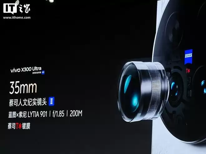 vivo X300 Ultra 还后置一枚 2 亿像素 35mm 蔡司人文纪实镜头 II,采用蓝图 × 索尼 LYTIA 901 传感器(1/1.12 英寸超大底)+ 蔡司 T* 镀膜,支持 f/1.85、原生 35mm 光学直出,配备 1G+6P 镜片结构: 1G ALD PRO + 超低反镀膜,反射率降低 30%;6P ALE + 镀膜和 ALM 镀膜,反射率降低 20%。