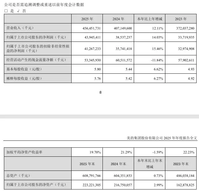 3月30日消息,美的集团今日发布 2025 年年度报告。公告原文显示,2025 年,美的营业总收入 4,585 亿元,同比增长 12%,实现归母净利润 439.5 亿元,同比增长 14%,实现扣非归母净利润 412.7 亿元,同比增长 15.5%。