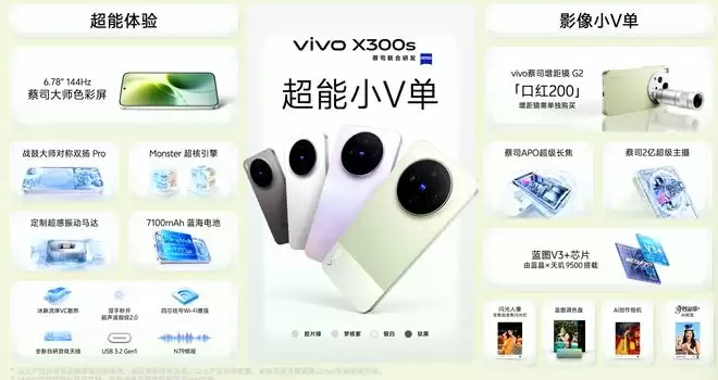 今天vivo还发布了X300s系列,“S”寓意是“Super”,其主要特点是兼顾影像和游戏性能,可以搭载“口红”大小的增距镜G2进行更好的长焦拍摄。