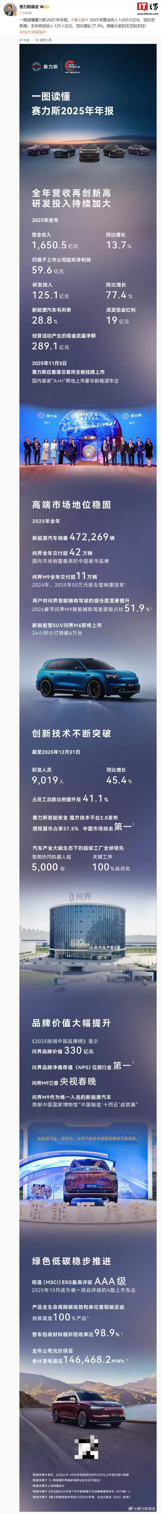 IT之家注意到,赛力斯集团副总裁康波发布了赛力斯 2025 年年报一图知,直观展示了公司营收数据、主营品牌销量情况等。