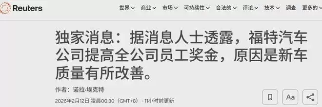事实上,在CEO涨薪前,福特汽车的全体员工已经涨薪了。2月11日,据路透社报道,据四位知情人士透露,福特汽车公司首席执 行官吉姆·法利周三在一次全体员工大会上告诉员工,公司将把所有员工奖金提高到 130%,并且此次上调适用于福特全球约7.5万名受薪员工。此次全员涨薪的主要理由也是“新车质量有所改善”。()