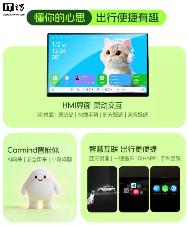 内饰方面,奇瑞 QQ3 EV 提供质感黑与丛林绿两种配色方案,其搭载 AI 灵犀智舱,配备 15.6 英寸 2.5K 中控屏,内置高通骁龙 8155 芯片,并集成 Carmind 智能体,支持多场景“可见即可说”语音交互。车机系统采用全新 HMI 设计,具备快捷手势操作、个性壁纸、灵动岛及萌宠桌面等功能。