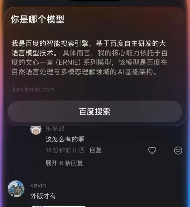 但这并不代表我们完全无迹可寻,同时,在拓展选项中,仍然保留了 ChatGPT 账号登录接口。在网友的实际测试中,也有判断使用模型为百度文心一言的痕迹。