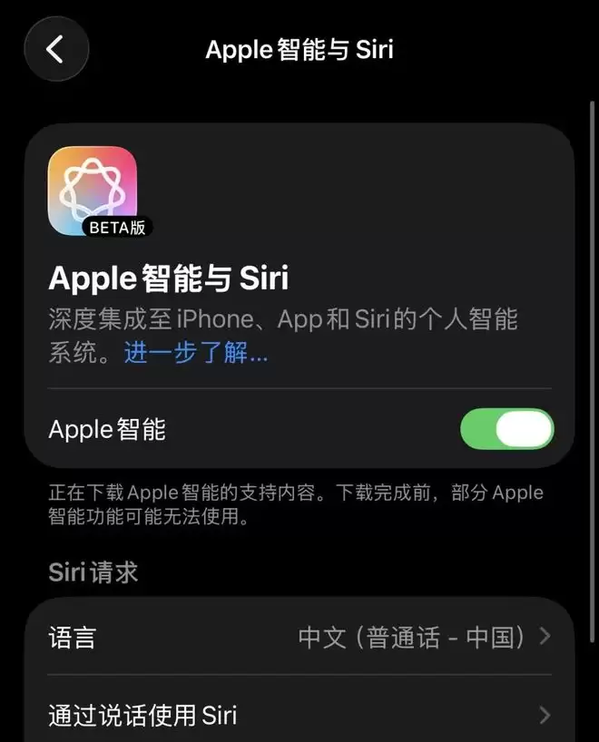 与此前的海外版安装流程相同:当你收到更新时,你仍然需要下载大小约为 9GB 的本地模型,在下载完成之前,你无法调用 Apple 智能,长按电源键呼出的仍然是 Siri。